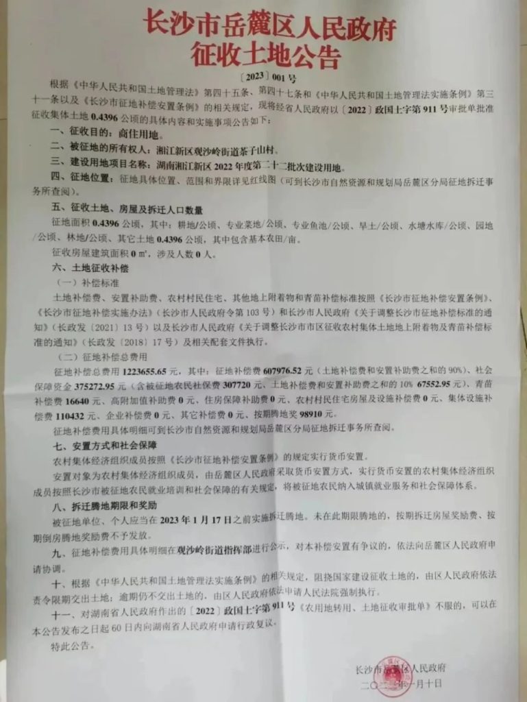 征收范围:湘江新区观沙岭街道茶子山村(公告1号地)