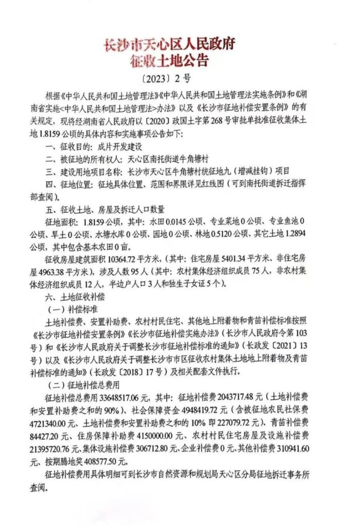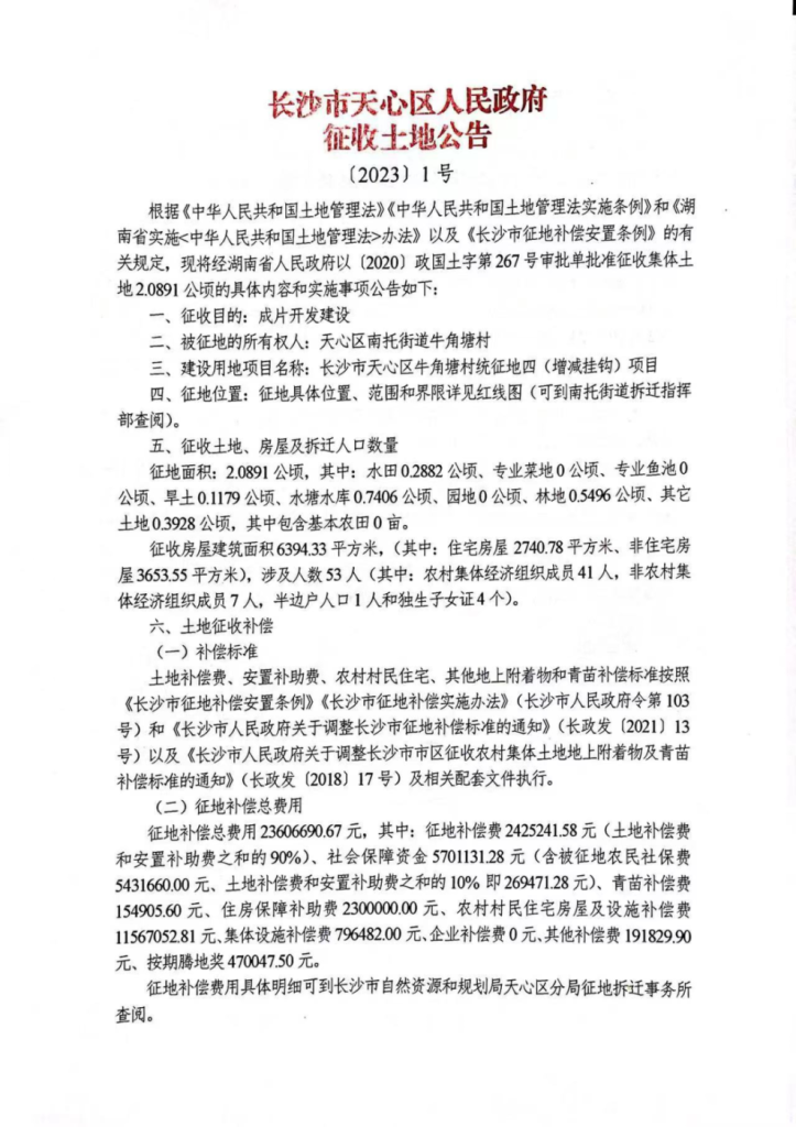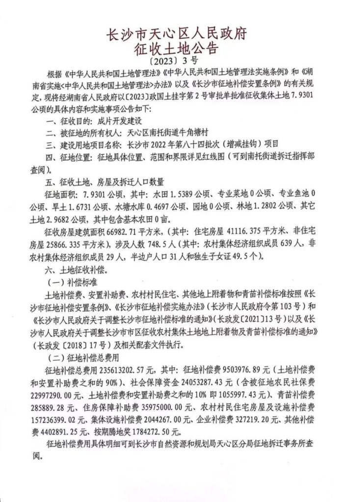 征收范围:天心区南托街道牛角塘村(公告1、2、3号地)