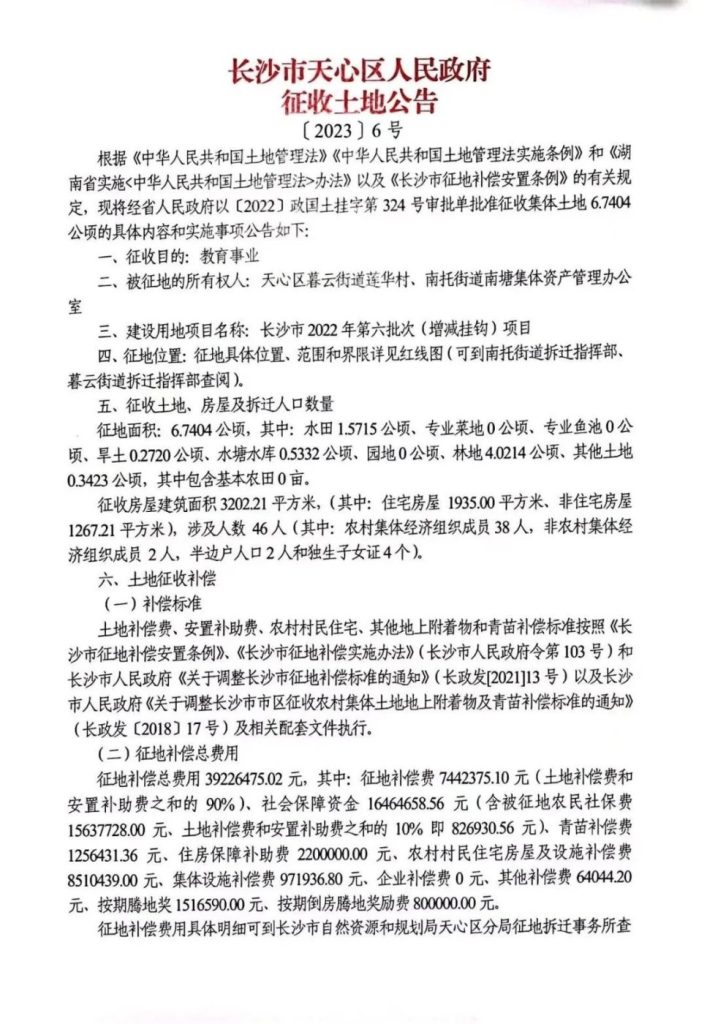 征收范围:天心区暮云街道莲华村、南托街道(公告6号地)