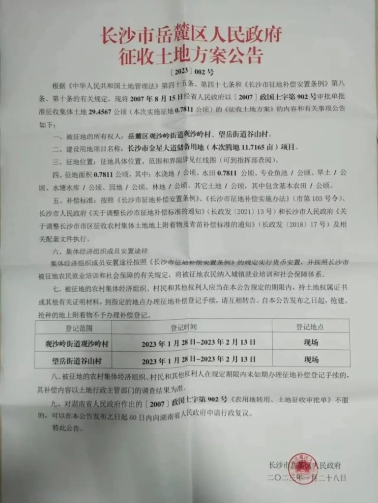 征收范围:岳麓区观沙岭街道观沙岭村、望岳街道谷山村(公告2号地)