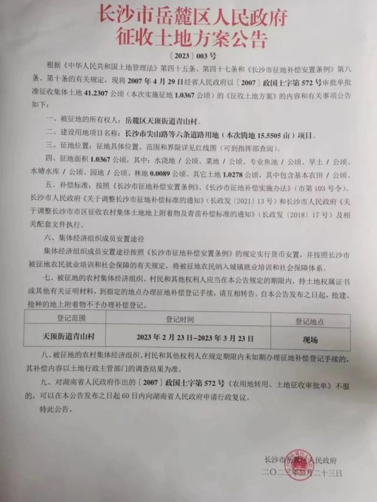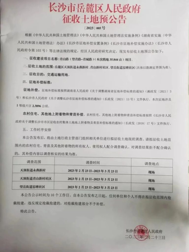 征收范围:岳麓区天顶街道青山村(公告3号地)