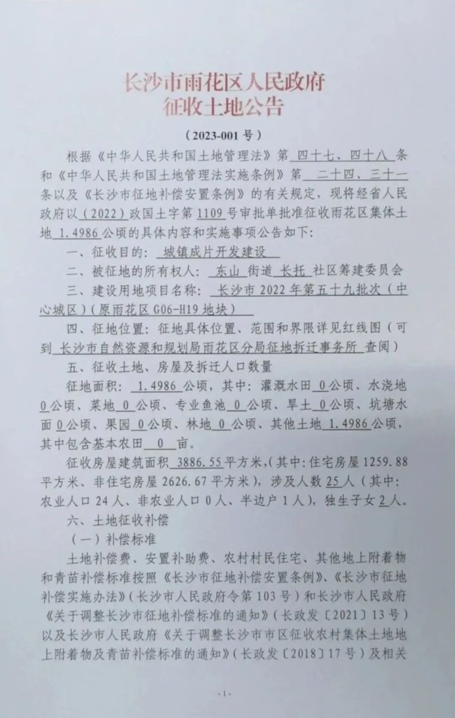 征收范围:开福区捞刀河街道中岭社区(公告1号地)